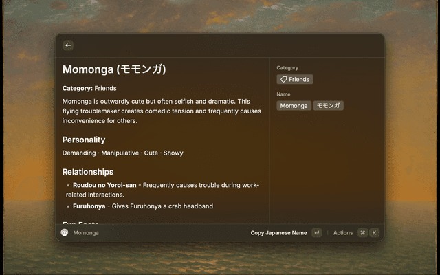 Raycast extension for searching and browsing Chiikawa character profiles offline. Character data and "open official page" actions use the official character pages.