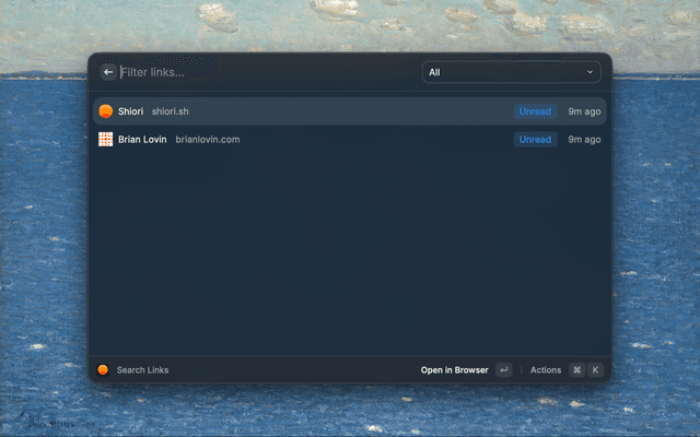 https:// if missing.⌘N inside Search Links to save whatever URL is on your clipboard.⌘R. Changes are optimistic so the UI updates instantly.shk_). See the API docs for details.| Command | Description | Mode |