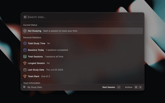 FocusFlow is a Raycast extension that helps you stay accountable by tracking focused study or work sessions (FOCUS) — and adds a bit of friendly competition through team collaboration (FLOW).