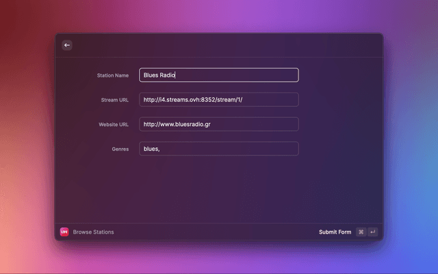 To add new stations, you can either use the built-in Search Stations command to search a dataset of known radio stations, or you can manually input a station using the New Station command.