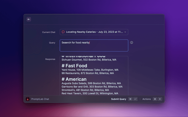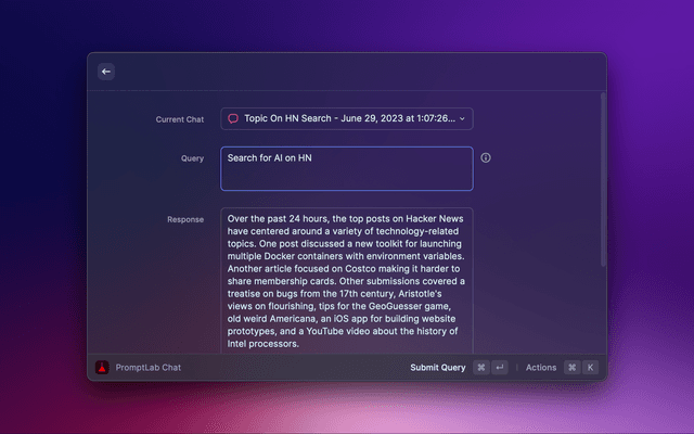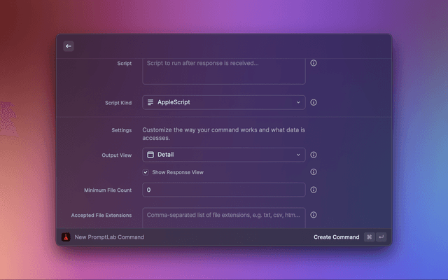 PromptLab also supports "action scripts" -- AppleScripts which run with the AI's response as input, as well as experimental autonomous agent features that allow the AI to run commands on your behalf. These capabilities, paired with PromptLab's extensive customization options, open a whole new world of possibilities for enhancing your workflows with AI.