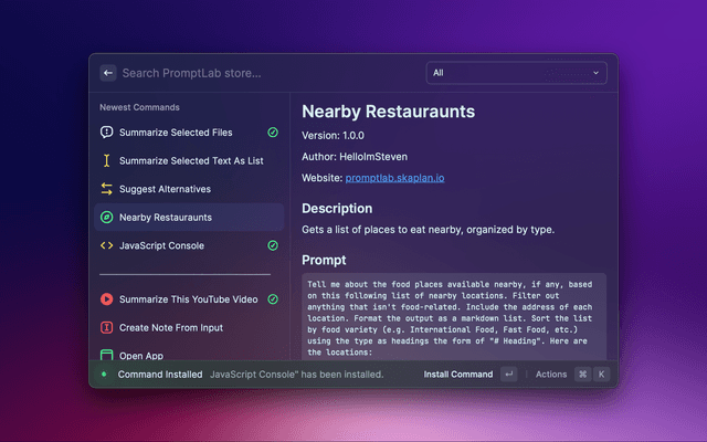 • Explore and search commands uploaded to the store by other PromptLab users.
