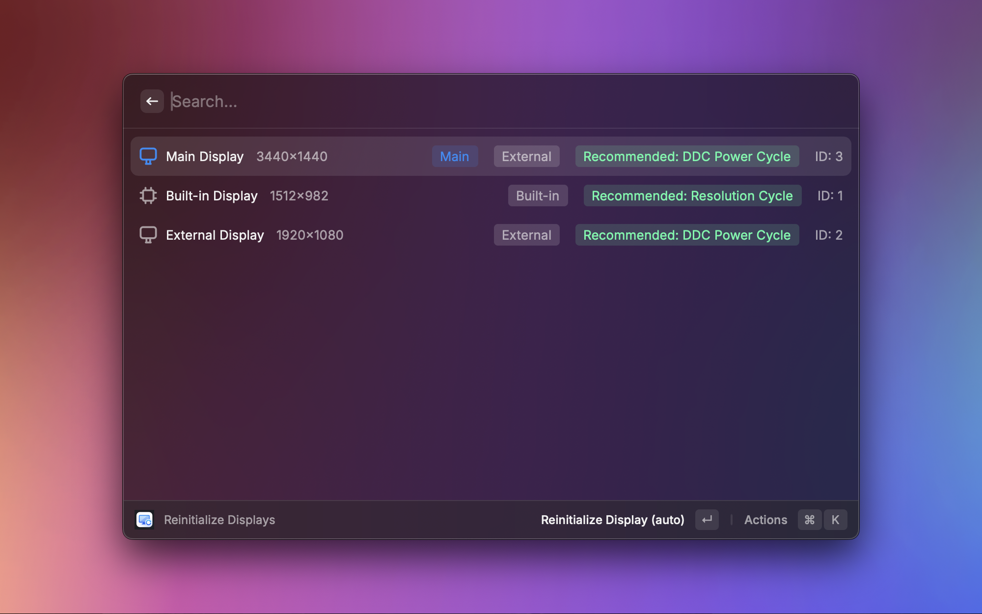 A Raycast extension to force re-detection and reinitialization of connected displays on macOS using multiple methods.