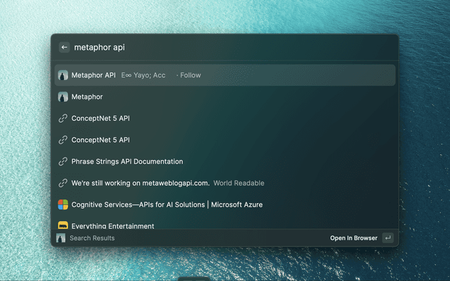Search with Metaphor API in Raycast. In order to use this extension, you need to get a Metaphor API on Metaphor's site.