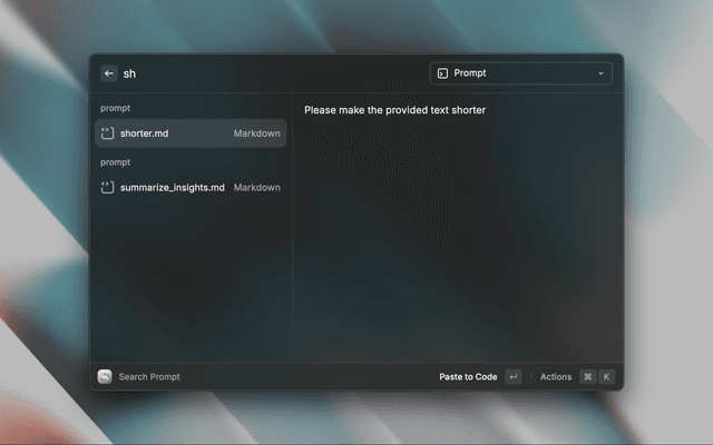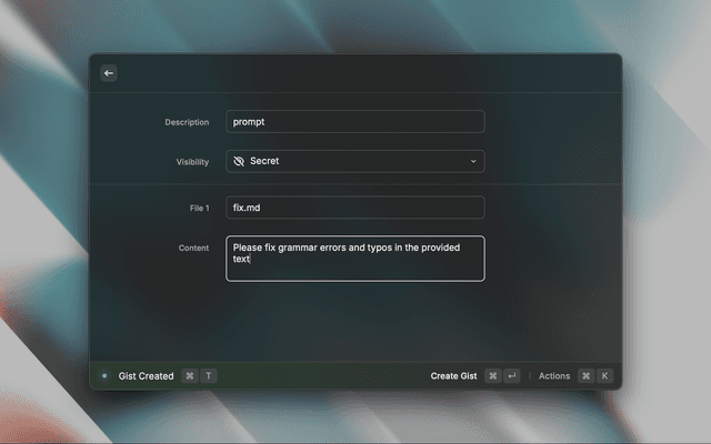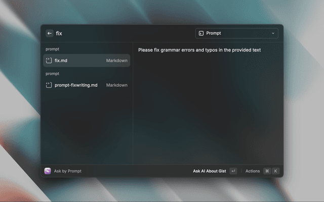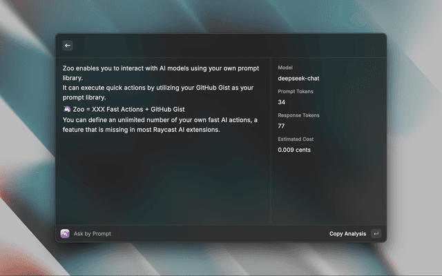 Zoo allows you to interact with AI models using your own prompt library. It can perform fast actions using your Github Gist as your prompt library. 🦄 Zoo = XXX Fast Actions + GitHub Gist You can define unlimited number of your own fast AI actions, which is missing for most Raycast AI extensions.