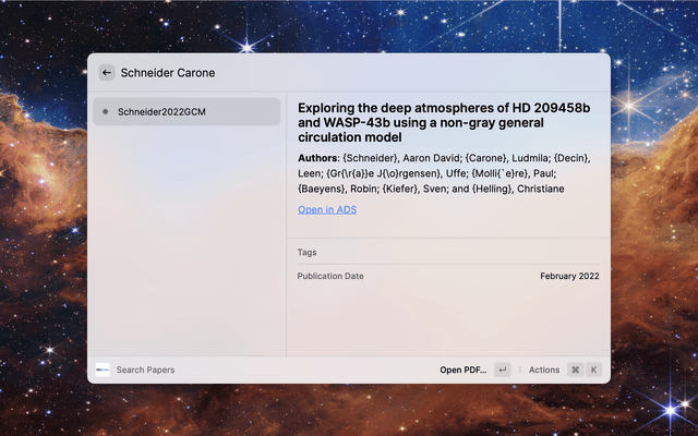 Extension for quickly accessing your bibmanager database from Raycast. Search the database (by bibkey, author, title, year or tags) and quickly access entries by opening or downloading the pdf. You can also open or copy the ADS link and copy the bibtex entry. Make sure to explore available actions in the action panel (⌘ + K).
