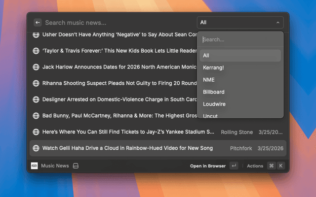 Read the latest music news from various sources directly in Raycast.