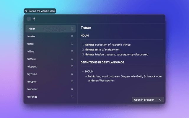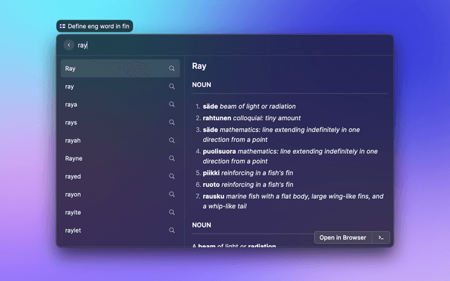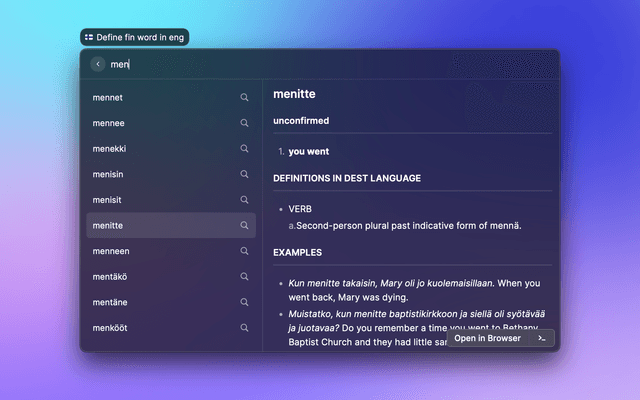 MacOS has a great dictionary, but it's not available for Finnish. This extension adds a Finnish dictionary at your fingertips.