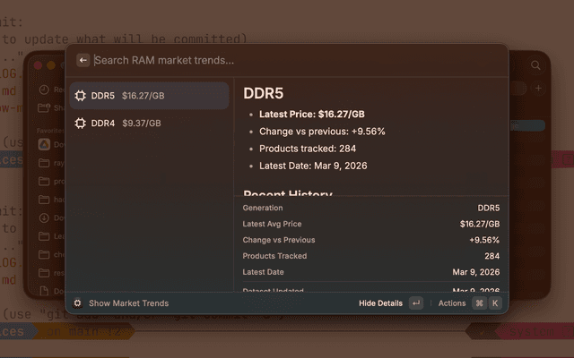 Show Market Trends shows DDR4 and DDR5 pricing in a searchable list.Market Trends Menu Bar shows the latest prices in the Raycast menu bar.Note: The Market Trends Menu Bar command is only available on macOS.