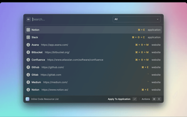 You should add a custom keyboard shortcut for Apply Inline Code before use it.