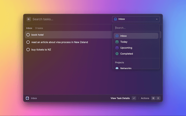 - View Tasks: Browse your tasks with multiple views (Inbox, Today, Upcoming, Completed)