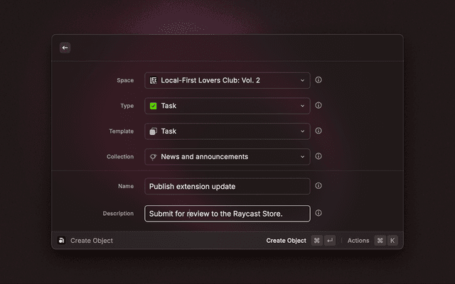 - Interact: Press Enter to view the object in Raycast or Command + Enter to open it in Anytype.