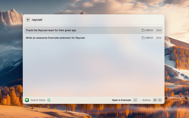 Evernote stores your notes in a SQLite database. On macOS this is in Library/Application Support/Evernote/conduit-storage/, and on Windows in AppData/Roaming/Evernote/conduit-storage/. This extension allows you to search for your notes using Raycast.