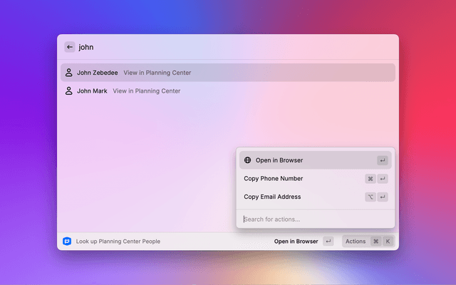 Quickly look up people in Planning Center and copy their contact info using Raycast.