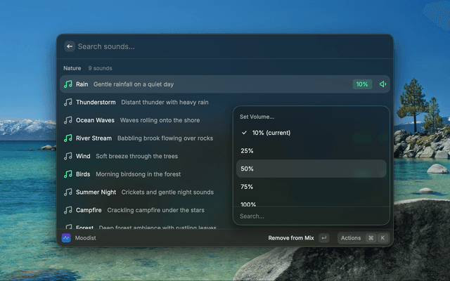 Ambient sound mixer for Raycast. Layer nature, urban, and electronic sounds to create your perfect focus or relaxation environment.