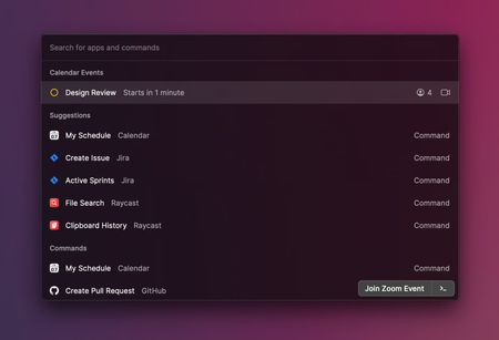 Raycast shows your next event on the top of the root search to make it convenient to join. Just hit ↵ to open the conference call. If there is a native app installed for the conference service, the app is opened directly without any annoying tabs.