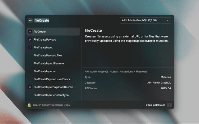 This Raycast extension searches through the Shopify developer documentation at https://shopify.dev/docs/ and lets you open up the result in your browser. Useful for quickly looking up GraphQL mutations and object types.