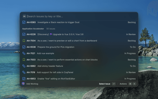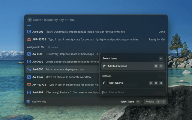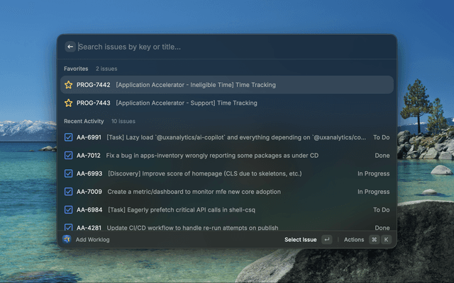 - Issue Selection: Browse favorites, recent activity, assigned issues, and project issues