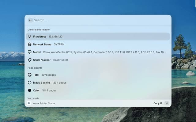 This Raycast extension allows you to quickly check key information about your Xerox WorkCentre 6515 printer directly from Raycast.