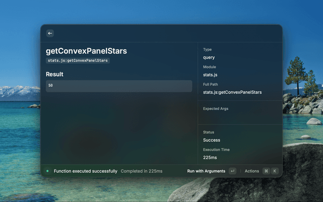 Interact with your Convex projects directly from Raycast. Switch between projects, run functions, browse tables, view real-time logs, search documentation, and explore components without leaving your keyboard.
