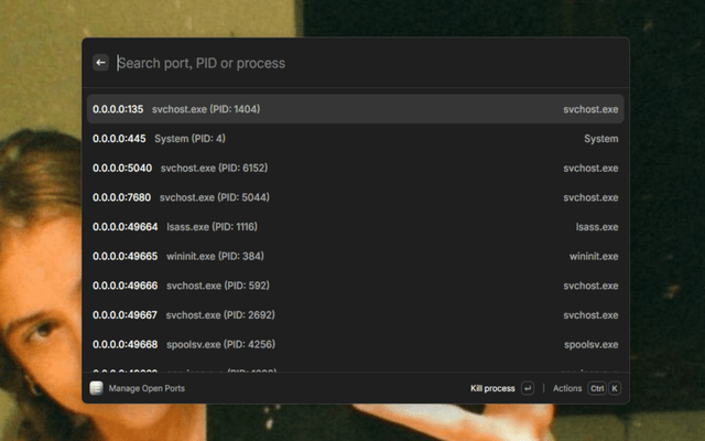 A powerful Raycast extension for monitoring and managing open ports on your system. Quickly view all active TCP ports, identify which processes are using them, and terminate processes with a single action. Platform support for Windows.