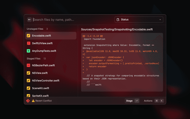 • List staged and unstaged files with their status (added, modified, deleted, conflicted, etc.)