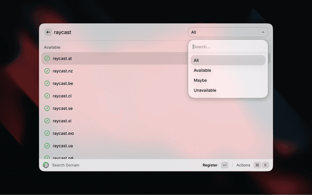 Sign up at Fastly if you don't have an account. You'll be required to provide a valid credit card number.Navigate to Domain Research APIClick "Enable" and then "Purchase Now" to enable the API (first 10,000 requests/month are free).Enable 2FA on your Fastly account (required to create API tokens)Navigate to API Tokens (you may need to reauthenticate)Click "+ Create Token"Enter a name, e.g. "Raycast"Enter this token in the extension's Preferences or at the first promptThis extension previously used the Domainr API via RapidAPI.