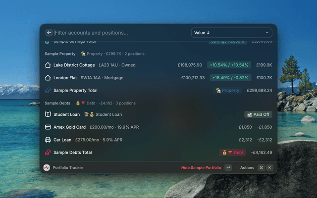 Track your investment portfolio and net worth in real time across multiple accounts, directly from Raycast.