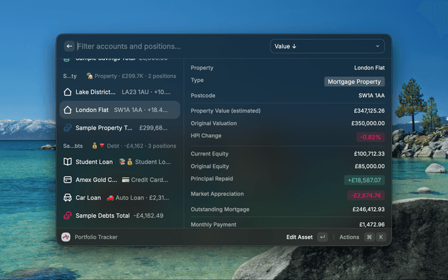 Add properties with or without a mortgage. Mortgage positions include full principal repayment tracking, UK HPI-based appreciation by postcode, shared ownership support, and a step-by-step breakdown of every calculation — equity, principal repaid, market movement — so you always know exactly how the number was derived.