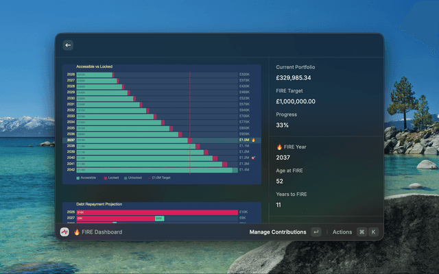 The FIRE (Financial Independence, Retire Early) dashboard reads your portfolio value and projects it forward against your configured targets. Set your FIRE number, expected growth rate, inflation, withdrawal rate, and retirement age — then add your recurring monthly contributions from any account. The dashboard renders a visual projection chart showing when you'll hit your target, how old you'll be, and how many days (and working days) you have left. Adjust assumptions on the fly and watch the projection update instantly.
