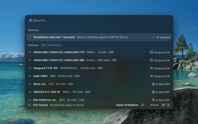 Portfolio TrackerView your portfolio, manage accounts and positions, track net worth. Import/Export via CSV is available from the action menu (⌘⇧I).