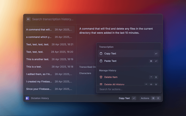 Enter when you are finished speaking.⌘ + . or click "Cancel Recording" to abort.whisper.cpp processes the audio. This may take a few seconds depending on the audio length and model size.Paste Text: Pastes the content.Copy Text (⌘ + Enter): Copies the content.PreferencesClose (Esc): Closes the Raycast window.Dictation History anytime you need a past transcription. It currently stores up to 100.