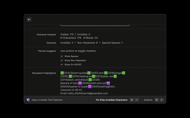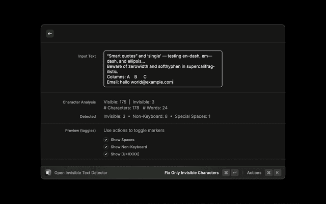 • Fix Invisible Characters: No‑view quick cleaner that operates on selected text or clipboard using your default mode.