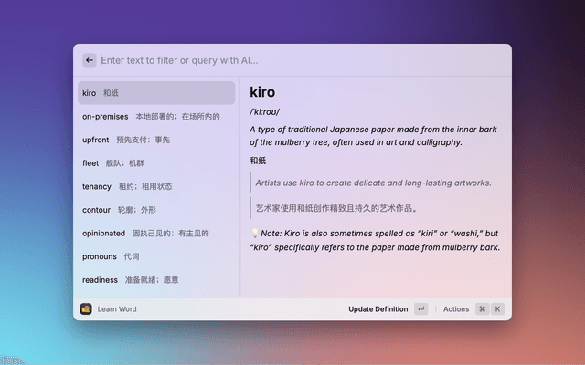 Easily look up words or translate text, support 48+ languages, support Linguee and Youdao dictionary, support OpenAI, DeepL, Google, Bing, Apple, Baidu, Tencent, Volcano, Youdao and Caiyun translation.