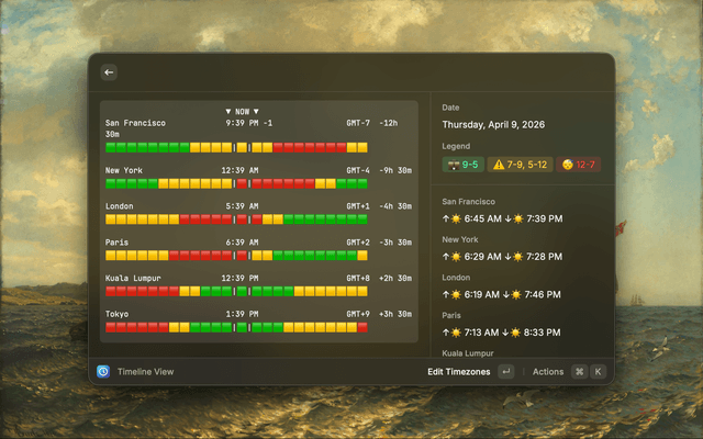 Cmd+E to add/remove cities← / → to shift time by your configured Arrow Key Scrub MinutesOption+← / Option+→ to shift by your configured Option+Arrow Key Scrub MinutesCmd+N to reset to current time| Shortcut | Action |