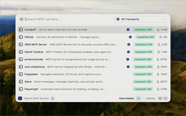 Search and discover MCP (Model Context Protocol) servers from the PulseMCP registry directly in Raycast.