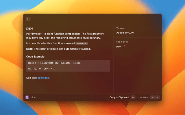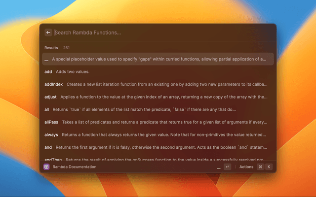 Offers quick and filterable Ramda documentation results.