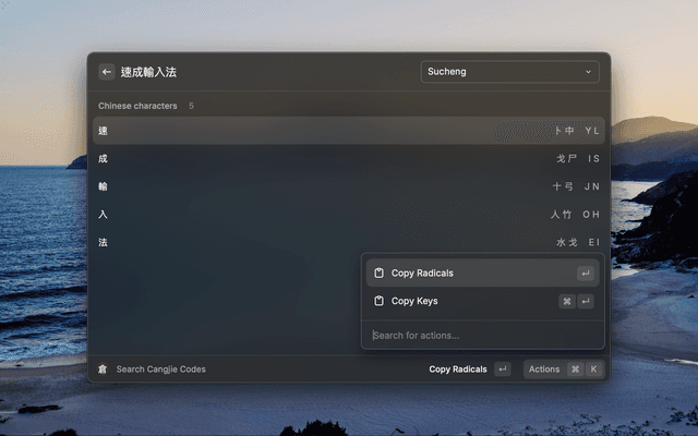 Look up Chinese characters for Cangjie and Sucheng codes, two major Chinese input methods. Supports instant search from selected text and provides both English letters and Chinese radicals in the actions panel.