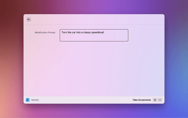 AI Screenshot allows you to take screenshots and modify them using Generative AI. It combines the GPT-4o's multimodal capability to generate a description of the image, and DALL-E's ability to generate convincing images from text descriptions.