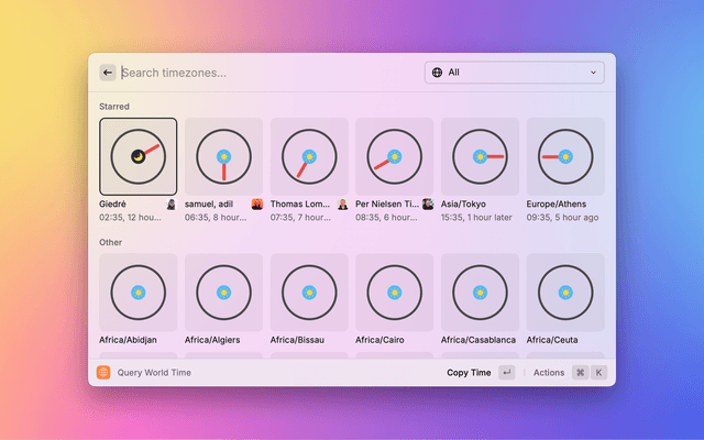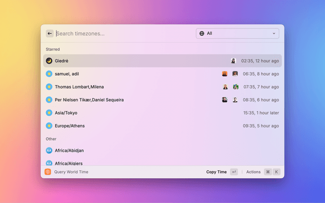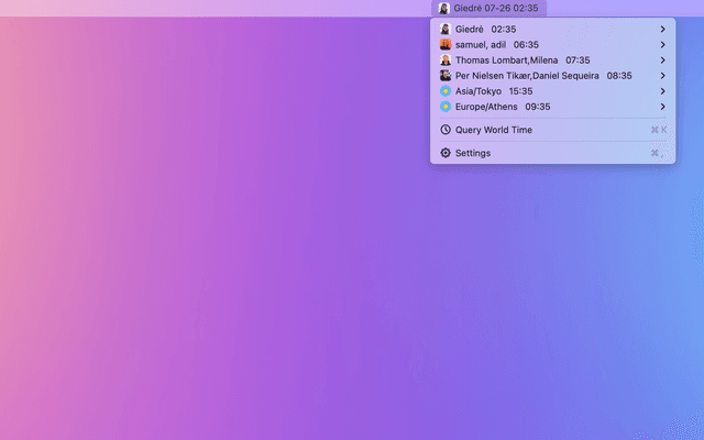 Set alias and avatar for your starred time zones and query the time of people far away.