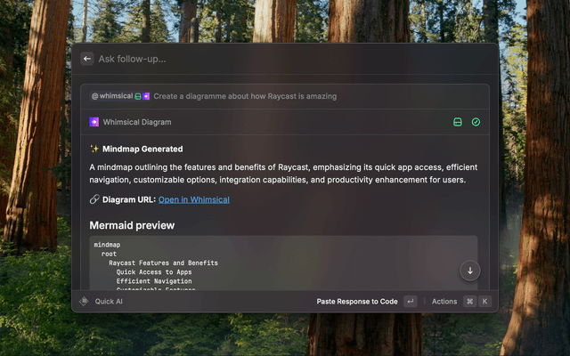 This extension leverages Raycast's AI capabilities and Whimsical's powerful diagram rendering API to create professional visualizations from simple text descriptions. Perfect for developers, designers, project managers, and anyone who needs to communicate ideas visually.