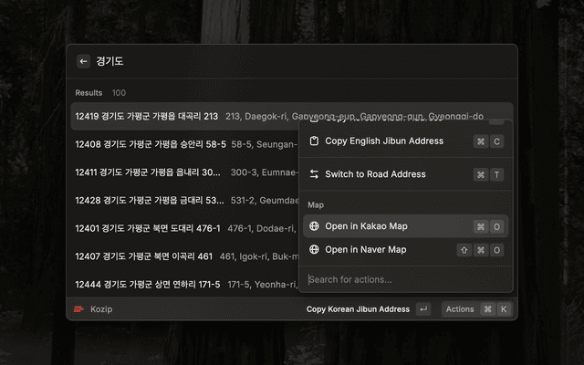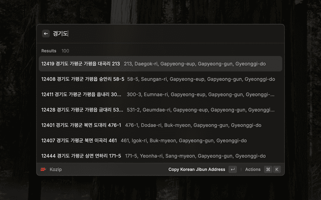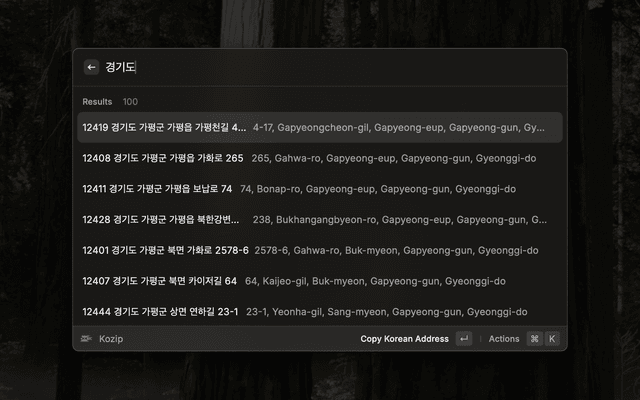 Postcodify API를 사용하여 한국 주소를 검색하는 Raycast 확장입니다. 다양한 형식의 한국 주소를 빠르게 찾고 복사할 수 있습니다.