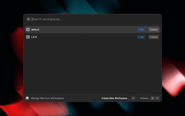 • Manage Workspaces — View all workspaces with tab/pane counts and rename them