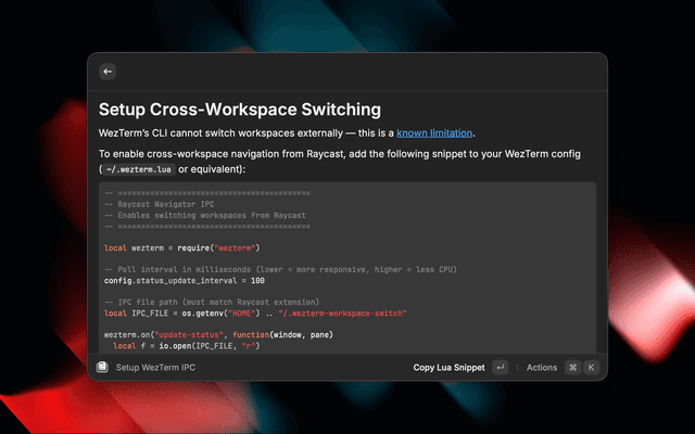 Or run the Setup WezTerm IPC command in Raycast to copy this snippet.