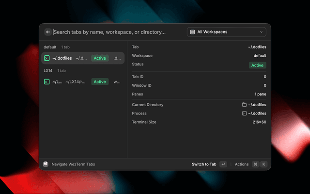 • Navigate Tabs — Browse all WezTerm tabs grouped by workspace with a detail panel showing current directory, terminal size, and pane information