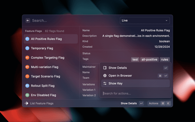 • 🏷️ View flag details including variations, targeting rules, and prerequisites