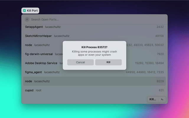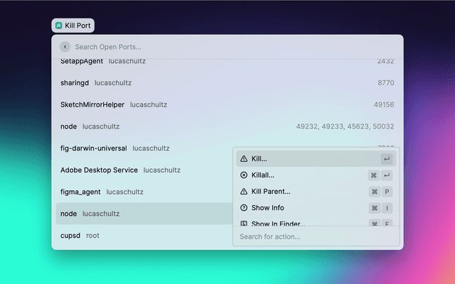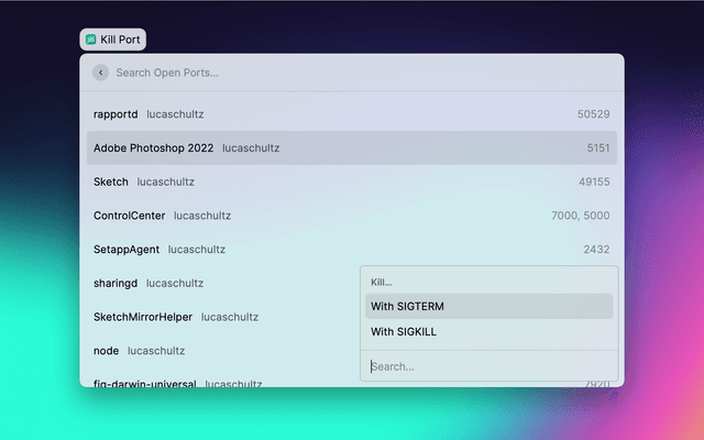 List open ports in Raycast and the menu bar, and kill the processes associated with these ports. Choose between two termination signals: the default SIGTERM