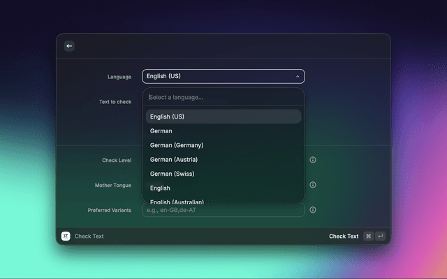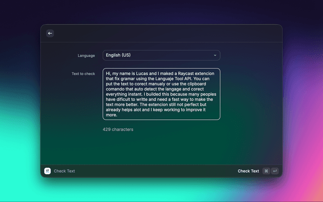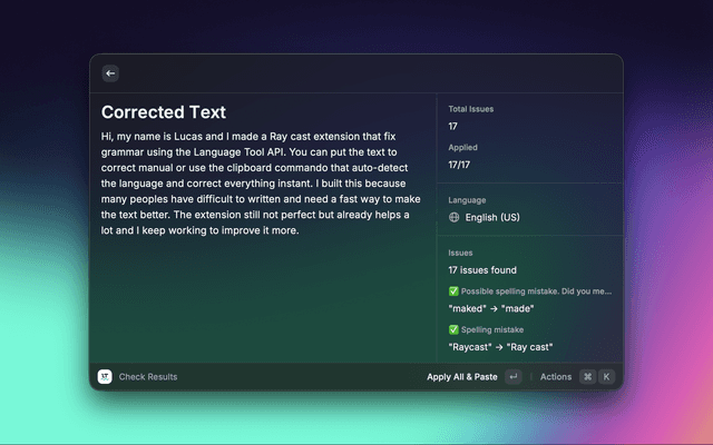 Raycast extension that provides instant spelling and grammar correction using LanguageTool. Type any text, get real-time suggestions, and copy the improved version. Ideal for developers, writers, and anyone who wants fast, high-quality text corrections in multiple languages.