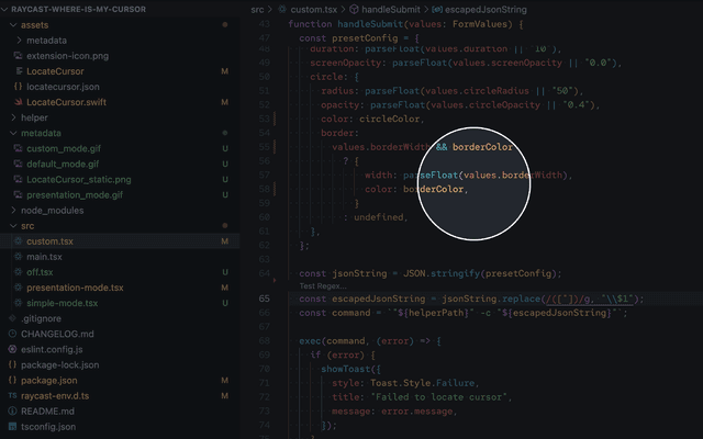 For the curious minds, this extension uses a small, pre-compiled Swift application located in the extension's assets. This app is responsible for creating the visual effects on the screen. The source code for this helper app is available in the assets/LocateCursor.swift file if you'd like to peek under the hood. The helper app is also available as a standalone project at github.com/luciodaou/LocateCursor.