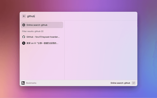 • Intuitive Search: Quickly locate any bookmark or content using the online search feature of Karakeep and the powerful search capabilities of Raycast.